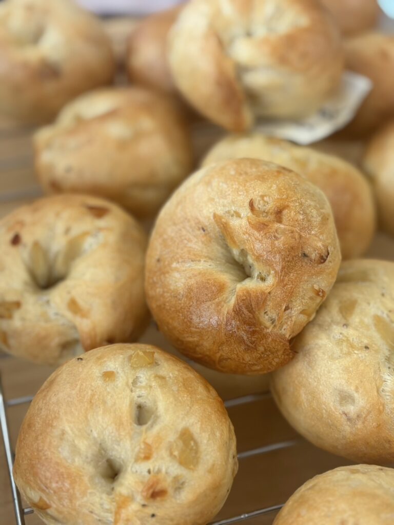 ベーグルは3種類! プレーン、オニオン入りベーグル、ゆかり&しその実ベーグル。