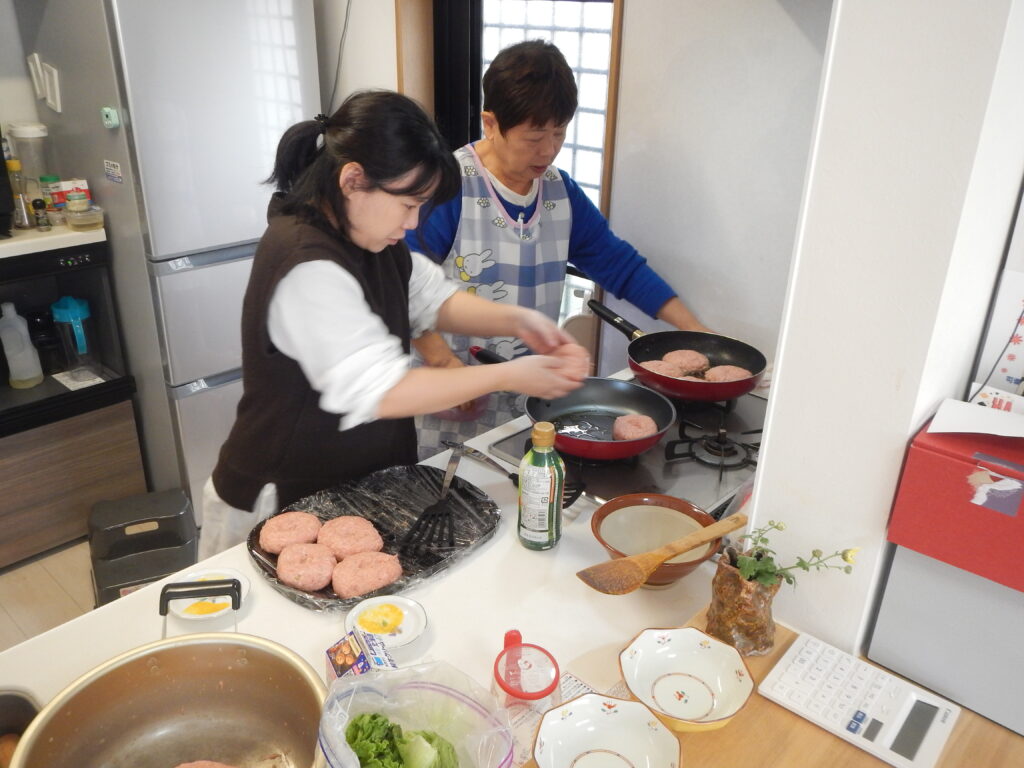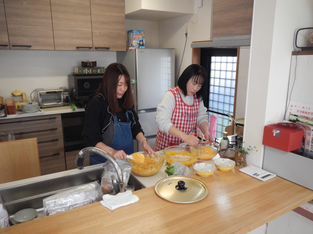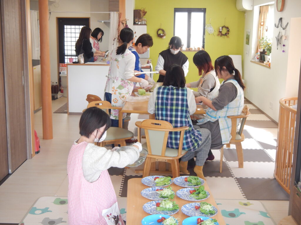 みんなでエプロンをして、日頃のことやお料理のコツ、お産のことなど様々なお話をしながら、手分けしてのお料理♪