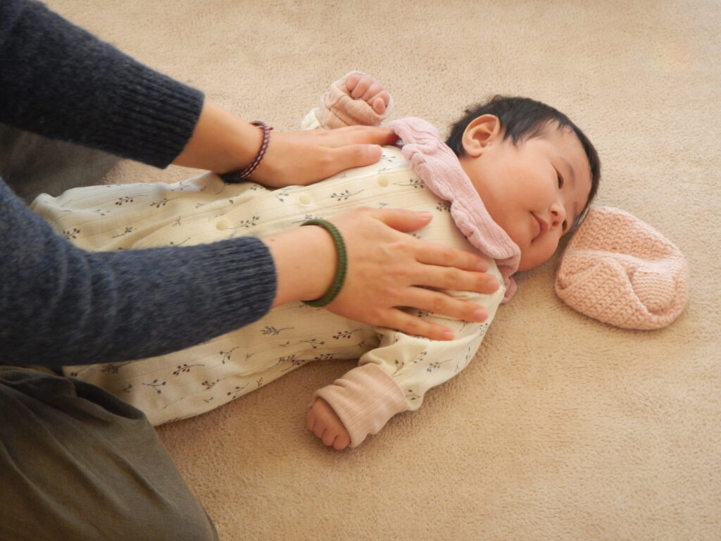マッサージ前は、ズリバイして自由に動いたり、おしゃべりしたり、おもちゃで遊んでいた赤ちゃん達ですが、